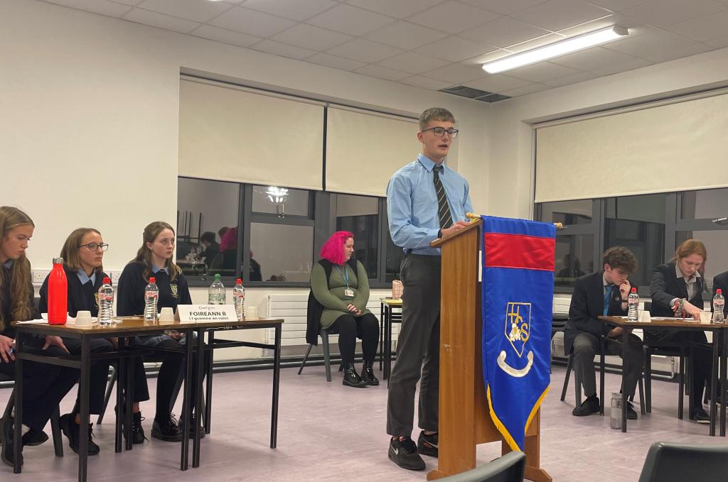 Well done to the Senior Irish Debating Team who won the first round of the Comórtas Uí Phiarsaigh debating competition. The team consisting of 6th Year students, Fionn McCarthy, Austin Brennan, Sam Fahey and Matthew Davis argued in favour of the motion: